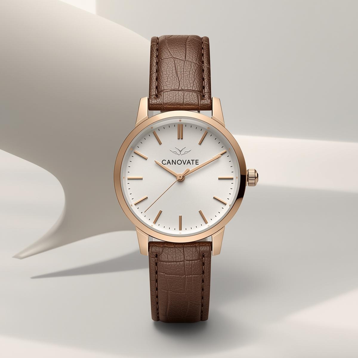 Discover timeless elegance with the Canovate Rose Gold & Brown Leather Women’s Watch. This exquisite timepiece is designed for the modern woman who appreciates sophistication and classic style. The watch features a polished rose gold-tone stainless steel case that beautifully complements the clean, minimalist white dial. Rose gold hour markers and hands provide a subtle touch of luxury and ensure easy readability.